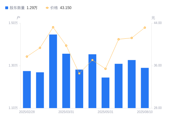 近一年(2024年8月20日至2025年8月10日),中英科技A股股东户数从1.47万户,减低至1.29万户,降幅12.57%,区间股价上涨30.64%。