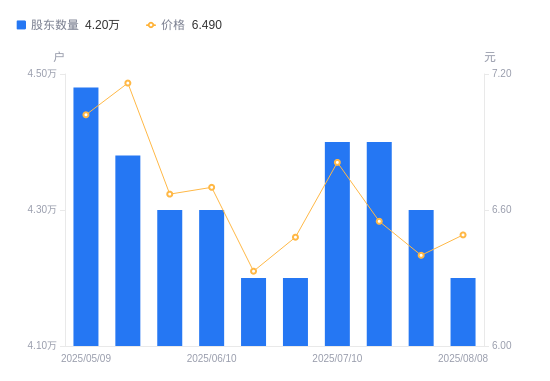 近一年(2024年8月9日至2025年8月8日),大连热电A股股东户数从4.78万户,减低至4.2万户,降幅12.13%,区间股价下跌9.48%。