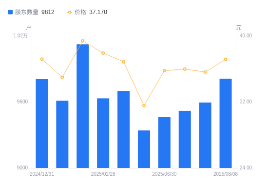 近一年(2024年9月20日至2025年8月8日),辰奕智能A股股东户数从1.23万户,减低至9812户,降幅20.53%,区间股价上涨23.08%。