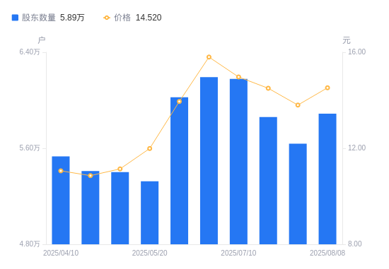 近一年(2024年8月9日至2025年8月8日),兆日科技A股股东户数从3.54万户,增加至5.89万户,增幅66.13%,区间股价上涨224.83%。