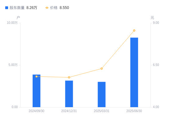 近一年(2024年6月30日至2025年6月30日),长城电工A股股东户数从3.96万户,增加至8.26万户,增幅108.59%,区间股价上涨86.68%。