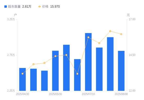 近一年(2024年8月9日至2025年8月8日),泰永长征A股股东户数从2.45万户,增加至2.81万户,增幅14.49%,区间股价上涨45.84%。