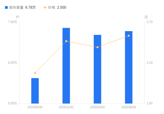 8月19日消息,数据显示,截至2025年6月30日,赤天化A股股东总户数为6.78万户,较上期(2025年3月31日)增加924户,增幅1.38%。公司最新A股总股本为16.89亿股,其中流通A股12.78亿股,户均持有流通A股数量为1.88万股,较上期减少260.35股,降幅1.36%;户均持流通A股市值4.71万元,较上期增加2596.76元,增幅5.83%。