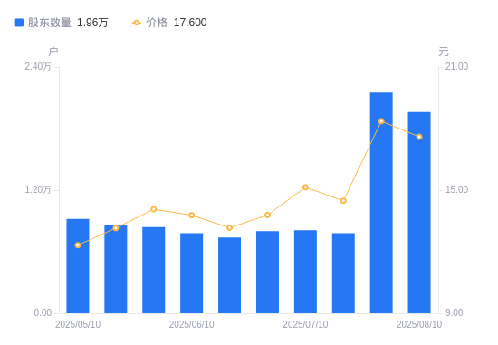 近一年(2024年8月20日至2025年8月10日),筑博设计A股股东户数从1.27万户,增加至1.96万户,增幅54.33%,区间股价上涨109.52%。