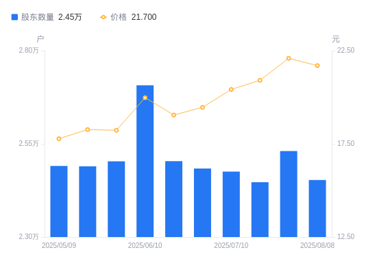 8月19日消息,数据显示,截至2025年8月8日,明德生物A股股东总户数为2.45万户,较上期(2025年7月31日)减少773户,降幅3.05%。公司最新A股总股本为2.33亿股,其中流通A股1.56亿股,户均持有流通A股数量为6362.51股,较上期增加194.36股,增幅3.15%;户均持流通A股市值13.81万元,较上期增加1811.98元,增幅1.33%。