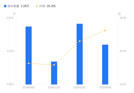 8月21日消息,数据显示,截至2025年6月30日,三祥新材A股股东总户数为3.28万户,较上期(2025年3月31日)减少2516户,降幅7.12%。公司最新A股总股本为4.23亿股,其中流通A股4.23亿股,户均持有流通A股数量为1.29万股,较上期增加918.54股,增幅7.67%;户均持流通A股市值33.86万元,较上期增加6.27万元,增幅22.72%。