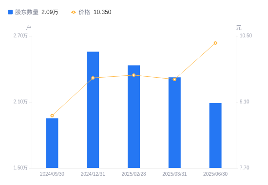 近一年(2024年6月30日至2025年6月30日),祥龙电业A股股东户数从2.05万户,增加至2.09万户,增幅1.90%,区间股价上涨64.55%。