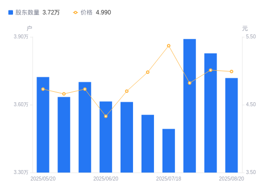 近一年(2024年8月20日至2025年8月20日),欣龙控股A股股东户数从3.76万户,减低至3.72万户,降幅1.24%,区间股价上涨59.94%。
