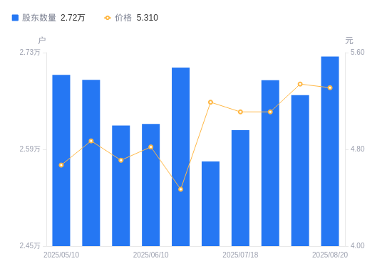 近一年(2024年9月20日至2025年8月20日),华斯股份A股股东户数从2.94万户,减低至2.72万户,降幅7.26%,区间股价上涨77.59%。