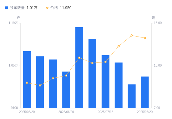 近一年(2024年8月20日至2025年8月20日),森赫股份A股股东户数从1.24万户,减低至1.01万户,降幅18.48%,区间股价上涨77.56%。