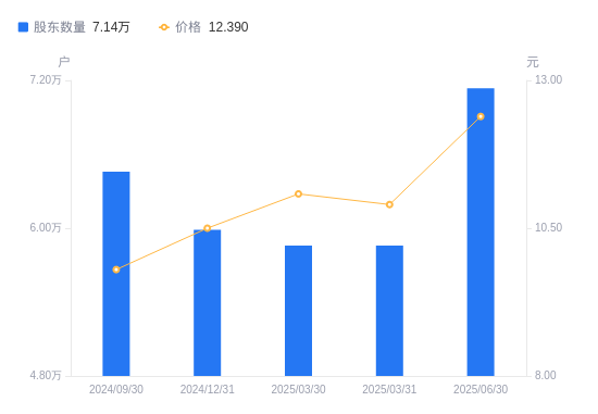 近一年(2024年6月30日至2025年6月30日),航天动力A股股东户数从6.39万户,增加至7.14万户,增幅11.66%,区间股价上涨59.66%。