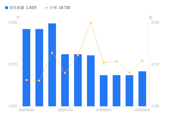 8月21日消息,数据显示,截至2025年8月20日,川网传媒A股股东总户数为1.93万户,较上期(2025年8月14日)增加370户,增幅1.95%。公司最新A股总股本为1.73亿股,其中流通A股1.73亿股,户均持有流通A股数量为8961.44股,较上期减少174.73股,降幅1.91%;户均持流通A股市值17.68万元,较上期增加3221.93元,增幅1.86%。