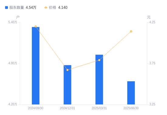近一年(2024年6月30日至2025年6月30日),珈伟新能A股股东户数从5.44万户,减低至4.54万户,降幅16.55%,区间股价上涨9.81%。