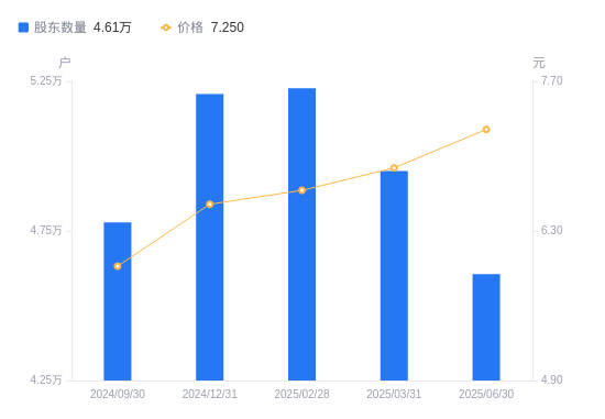 8月22日消息,数据显示,截至2025年6月30日,铜峰电子A股股东总户数为4.61万户,较上期(2025年3月31日)减少3447户,降幅6.96%。公司最新A股总股本为6.31亿股,其中流通A股6.22亿股,户均持有流通A股数量为1.35万股,较上期增加939.76股,增幅7.48%;户均持流通A股市值9.79万元,较上期增加1.13万元,增幅13.10%。