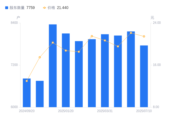 近一年(2024年6月30日至2025年6月30日),晶华微A股股东户数从7625户,增加至8157户,增幅6.98%,区间股价上涨32.00%。