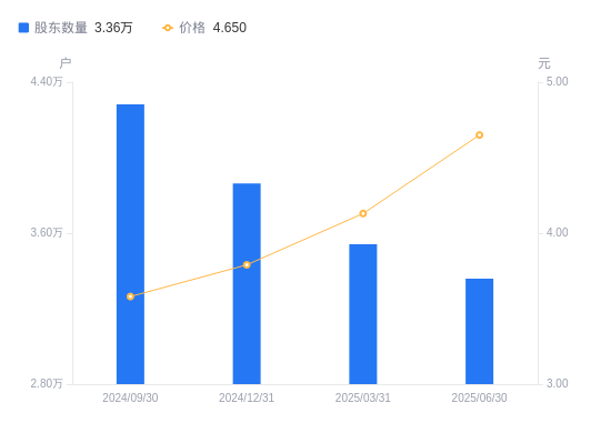 近一年(2024年6月30日至2025年6月30日),福建水泥A股股东户数从3.98万户,减低至3.36万户,降幅15.68%,区间股价上涨67.27%。