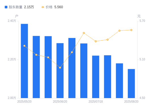 近一年(2024年8月20日至2025年8月20日),中建环能A股股东户数从2.08万户,增加至2.15万户,增幅3.51%,区间股价上涨35.48%。