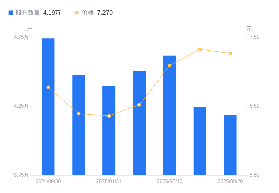 近一年(2024年9月30日至2025年8月20日),新农开发A股股东户数从4.74万户,减低至4.19万户,降幅11.68%,区间股价上涨14.85%。