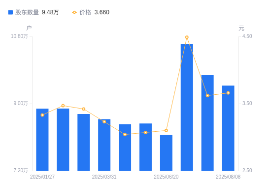 近一年(2024年8月20日至2025年8月8日),拓日新能A股股东户数从9.16万户,增加至9.48万户,增幅3.48%,区间股价上涨31.18%。