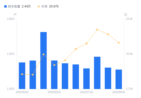 8月22日消息,数据显示,截至2025年8月20日,明德生物A股股东总户数为2.44万户,较上期(2025年8月8日)减少142户,降幅0.58%。公司最新A股总股本为2.33亿股,其中流通A股1.56亿股,户均持有流通A股数量为6399.56股,较上期增加37.04股,增幅0.58%;户均持流通A股市值13.42万元,较上期减少3867.84元,降幅2.80%。