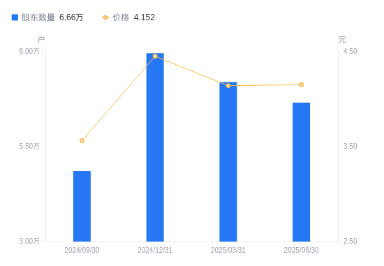 8月25日消息,数据显示,截至2025年6月30日,益民集团A股股东总户数为6.66万户,较上期(2025年3月31日)减少5428户,降幅7.54%。公司最新A股总股本为10.54亿股,其中流通A股10.54亿股,户均持有流通A股数量为1.58万股,较上期增加1193.66股,增幅8.15%;户均持流通A股市值6.57万元,较上期增加5102.46元,增幅8.41%。