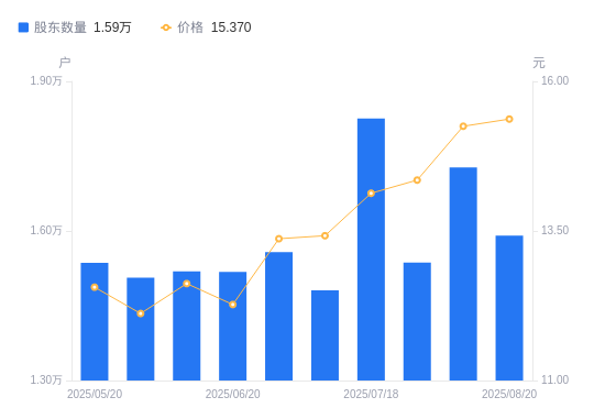 近一年(2024年8月20日至2025年8月20日),欣天科技A股股东户数从1.9万户,减低至1.59万户,降幅16.10%,区间股价上涨46.38%。