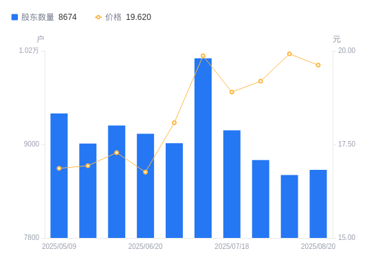 近一年(2024年8月20日至2025年8月20日),深圳瑞捷A股股东户数从1.19万户,减低至8674户,降幅27.09%,区间股价上涨31.59%。