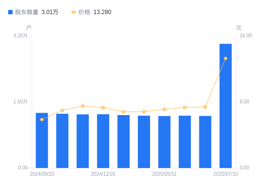 近一年(2024年6月30日至2025年6月30日),森林包装A股股东户数从1.4万户,减低至1.26万户,降幅10.29%,区间股价上涨26.32%。