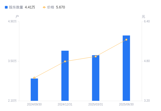 近一年(2024年6月30日至2025年6月30日),重庆港A股股东户数从2.93万户,增加至4.41万户,增幅50.57%,区间股价上涨57.94%。