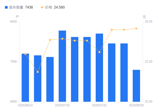 近一年(2024年6月30日至2025年6月30日),超越科技A股股东户数从1.02万户,减低至7696户,降幅24.31%,区间股价上涨32.92%。