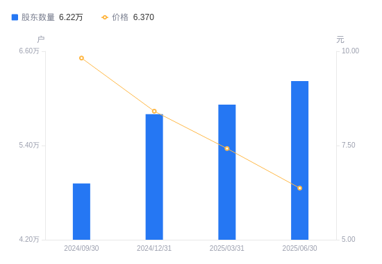 8月25日消息,数据显示,截至2025年6月30日,兰花科创A股股东总户数为6.22万户,较上期(2025年3月31日)增加3005户,增幅5.08%。公司最新A股总股本为14.73亿股,其中流通A股14.73亿股,户均持有流通A股数量为2.37万股,较上期减少1201.83股,降幅4.83%;户均持流通A股市值15.08万元,较上期减少3.38万元,降幅18.30%。