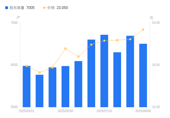 近一年(2024年6月30日至2025年6月30日),雅艺科技A股股东户数从6679户,增加至7105户,增幅6.38%,区间股价上涨41.65%。