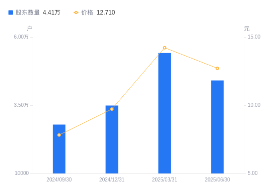 近一年(2024年6月30日至2025年6月30日),弘讯科技A股股东户数从2.93万户,增加至4.41万户,增幅50.71%,区间股价上涨69.24%。