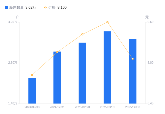 8月25日消息,数据显示,截至2025年6月30日,鲍斯股份A股股东总户数为3.62万户,较上期(2025年3月31日)减少2631户,降幅6.77%。公司最新A股总股本为6.44亿股,其中流通A股6.27亿股,户均持有流通A股数量为1.73万股,较上期增加1171.16股,增幅7.26%;户均持流通A股市值14.12万元,较上期减少1.37万元,降幅8.83%。