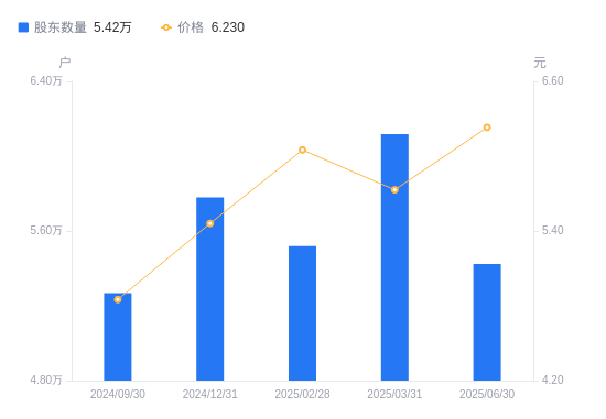 近一年(2024年6月30日至2025年6月30日),六国化工A股股东户数从5.45万户,减低至5.42万户,降幅0.48%,区间股价上涨63.09%。