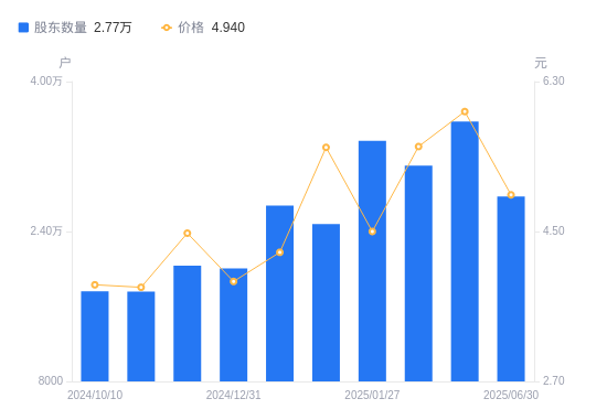 8月25日消息,数据显示,截至2025年6月30日,远程股份(维权)A股股东总户数为2.77万户,较上期(2025年3月31日)减少8005户,降幅22.40%。公司最新A股总股本为7.18亿股,其中流通A股7.18亿股,户均持有流通A股数量为2.59万股,较上期增加5797.98股,增幅28.86%;户均持流通A股市值12.79万元,较上期增加8555.16元,增幅7.17%。