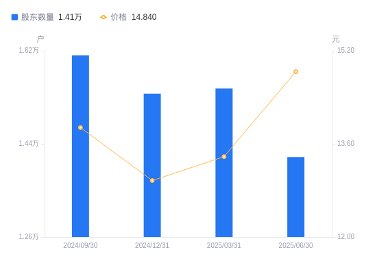 8月25日消息,数据显示,截至2025年6月30日,新光药业A股股东总户数为1.41万户,较上期(2025年3月31日)减少1324户,降幅8.56%。公司最新A股总股本为1.6亿股,其中流通A股1.14亿股,户均持有流通A股数量为8065.88股,较上期增加690.32股,增幅9.36%;户均持流通A股市值11.97万元,较上期增加2.1万元,增幅21.29%。