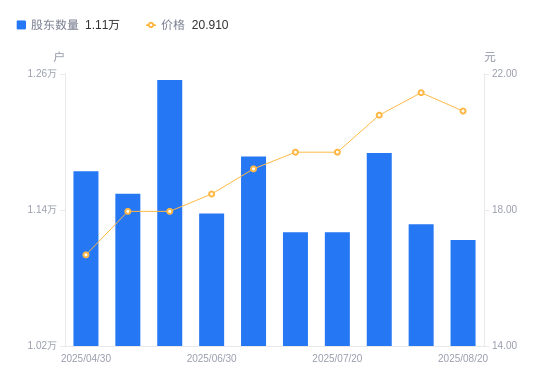 8月25日消息,数据显示,截至2025年8月20日,东亚药业A股股东总户数为1.11万户,较上期(2025年8月10日)减少138户,降幅1.22%。公司最新A股总股本为1.15亿股,其中流通A股1.13亿股,户均持有流通A股数量为1.01万股,较上期增加123.75股,增幅1.24%;户均持流通A股市值21.14万元,较上期减少2804.89元,降幅1.31%。