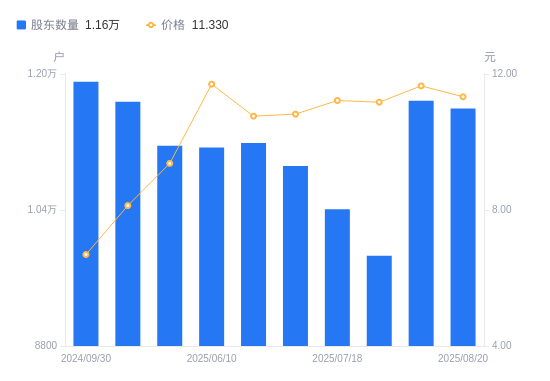 近一年(2024年9月30日至2025年8月20日),镇海股份A股股东户数从1.19万户,减低至1.16万户,降幅2.64%,区间股价上涨81.28%。
