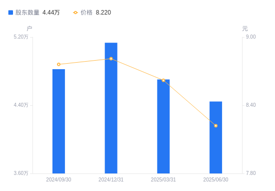 近一年(2024年6月30日至2025年6月30日),芯能科技A股股东户数从5.31万户,减低至4.44万户,降幅16.29%,区间股价下跌4.42%。