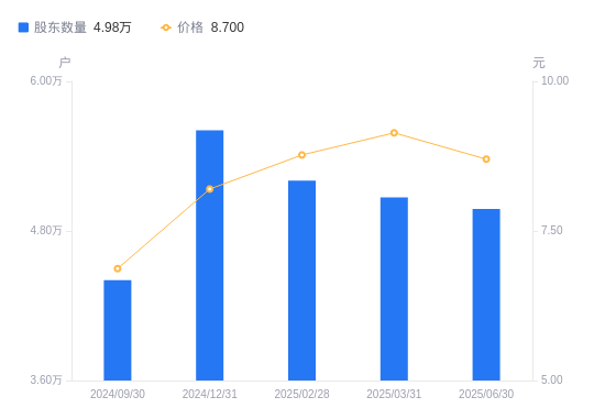 8月26日消息,数据显示,截至2025年6月30日,佳力图A股股东总户数为4.98万户,较上期(2025年3月31日)减少926户,降幅1.83%。公司最新A股总股本为5.42亿股,其中流通A股5.42亿股,户均持有流通A股数量为1.09万股,较上期增加199.16股,增幅1.86%;户均持流通A股市值9.47万元,较上期减少2971.02元,降幅3.04%。