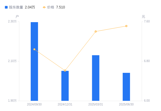 8月26日消息,数据显示,截至2025年6月30日,新中港A股股东总户数为2.04万户,较上期(2025年3月31日)减少891户,降幅4.18%。公司最新A股总股本为4.01亿股,其中流通A股4.01亿股,户均持有流通A股数量为1.96万股,较上期增加820.71股,增幅4.37%;户均持流通A股市值14.74万元,较上期增加8231.76元,增幅5.92%。
