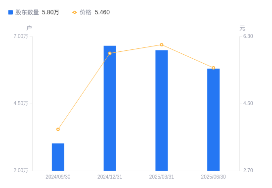 8月26日消息,数据显示,截至2025年6月30日,华昌达A股股东总户数为5.8万户,较上期(2025年3月31日)减少6856户,降幅10.57%。公司最新A股总股本为14.22亿股,其中流通A股14.17亿股,户均持有流通A股数量为2.44万股,较上期增加2583.93股,增幅11.82%;户均持流通A股市值13.34万元,较上期增加558.71元,增幅0.42%。