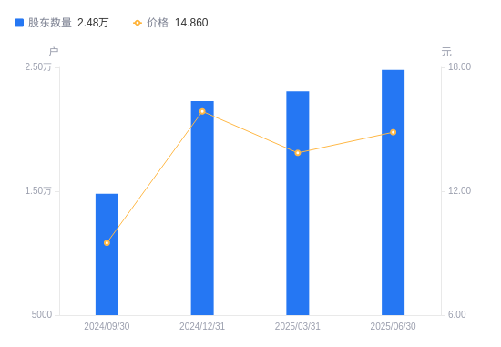 近一年(2024年6月30日至2025年6月30日),蠡湖股份A股股东户数从1.56万户,增加至2.48万户,增幅58.64%,区间股价上涨76.28%。