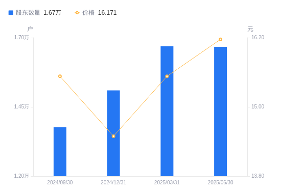 近一年(2024年6月30日至2025年6月30日),元力股份A股股东户数从1.33万户,增加至1.67万户,增幅25.73%,区间股价上涨20.48%。