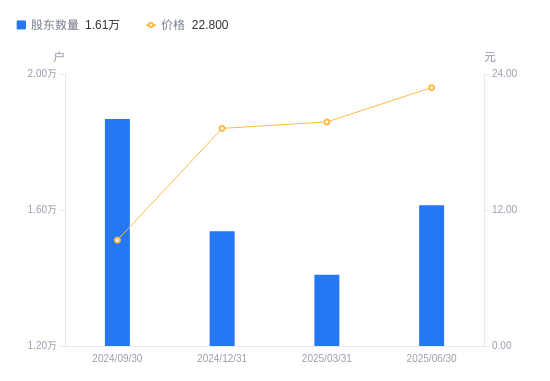 8月26日消息,数据显示,截至2025年6月30日,天津普林A股股东总户数为1.61万户,较上期(2025年3月31日)增加2040户,增幅14.47%。公司最新A股总股本为2.46亿股,其中流通A股2.46亿股,户均持有流通A股数量为1.52万股,较上期减少2204.7股,降幅12.64%;户均持流通A股市值34.74万元,较上期增加2575.52元,增幅0.75%。