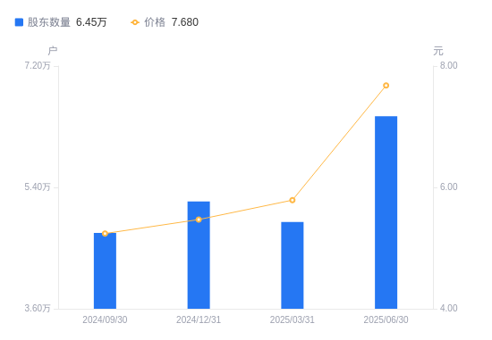 8月26日消息,数据显示,截至2025年6月30日,富春股份A股股东总户数为6.45万户,较上期(2025年3月31日)增加1.57万户,增幅32.07%。公司最新A股总股本为6.9亿股,其中流通A股6.89亿股,户均持有流通A股数量为1.07万股,较上期减少3424.89股,降幅24.28%;户均持流通A股市值8.2万元,较上期增加353.54元,增幅0.43%。