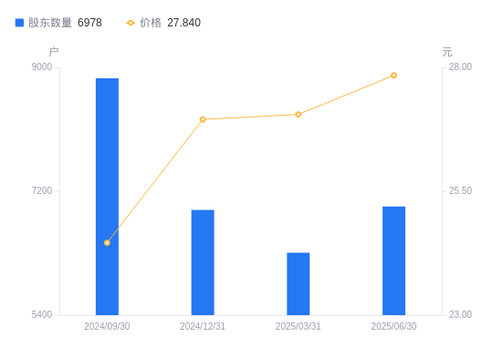 8月26日消息,数据显示,截至2025年6月30日,拓山重工A股股东总户数为6978户,较上期(2025年3月31日)增加673户,增幅10.67%。公司最新A股总股本为7466.67万股,其中流通A股1866.67万股,户均持有流通A股数量为2675.08股,较上期减少285.54股,降幅9.64%;户均持流通A股市值7.45万元,较上期减少5610.54元,降幅7.01%。