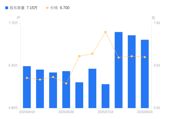 近一年(2024年8月20日至2025年8月8日),海南高速A股股东户数从5.91万户,增加至7.3万户,增幅23.41%,区间股价上涨54.84%。