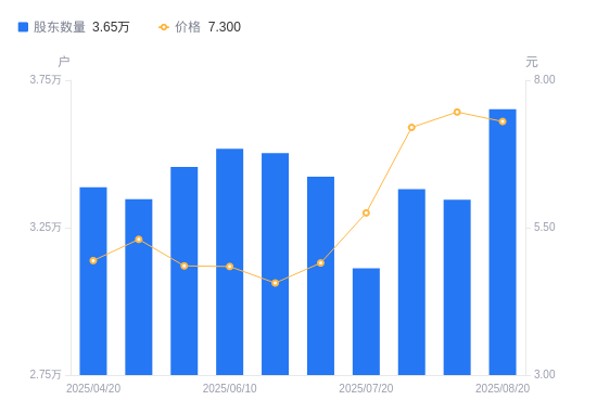 近一年(2024年9月20日至2025年8月20日),濮耐股份A股股东户数从3.56万户,增加至3.65万户,增幅2.44%,区间股价上涨126.64%。
